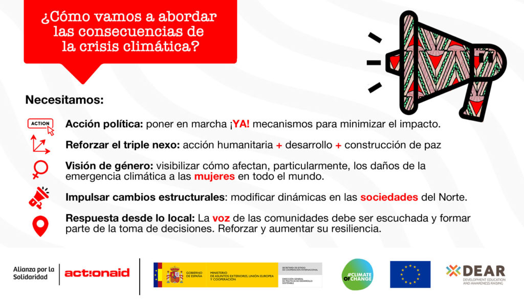 Una última petición de #ClimateOfChange es que se reconozcan no solo las catástrofes naturales, sino también los efectos de evolución lenta del cambio climático como motores de las migraciones que exigen medidas de protección y apoyo a las personas que se ven obligadas a desplazarse dentro de su propio país o entre países.